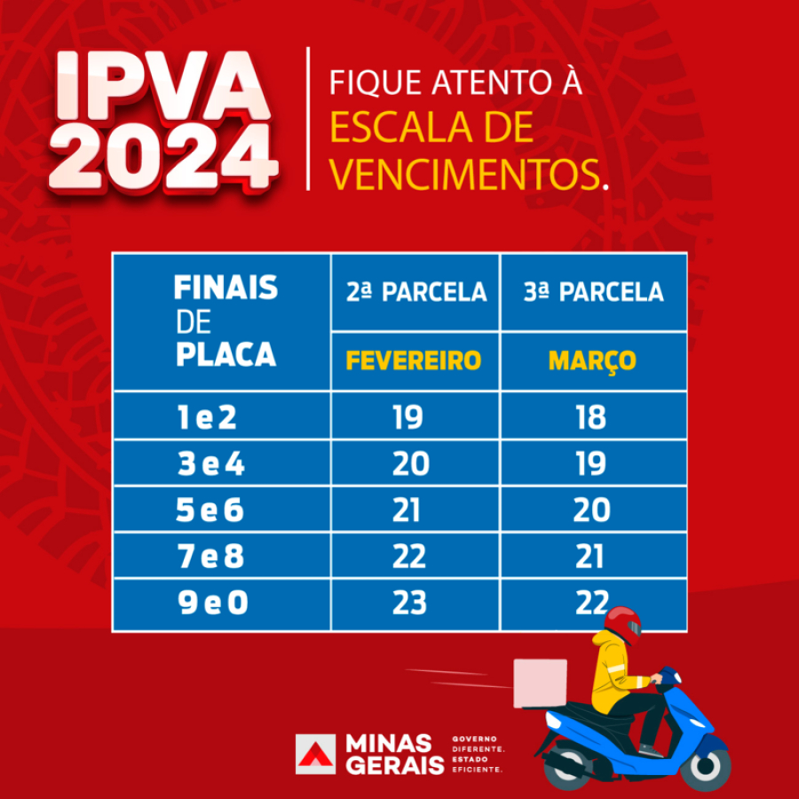 A segunda parcela do Imposto sobre a Propriedade de Veículos Automotores (IPVA) vence nesta quarta-feira (21), para placas com finais 5 e 6, e vai até sexta-feira (23), para os finais 9 e 0. Quem parcelou o pagamento em Minas deve ficar atento para o calendário. O valor depende do modelo do veículo.