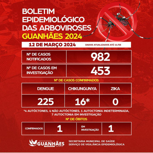 Nessa terça-feira, 12, o município de Guanhães divulgou o quarto Boletim Epidemiológico semanal das arboviroses na cidade (dengue, zika e Chikungunya). As notificações e casos confirmados, continuam numa grande crescente.
