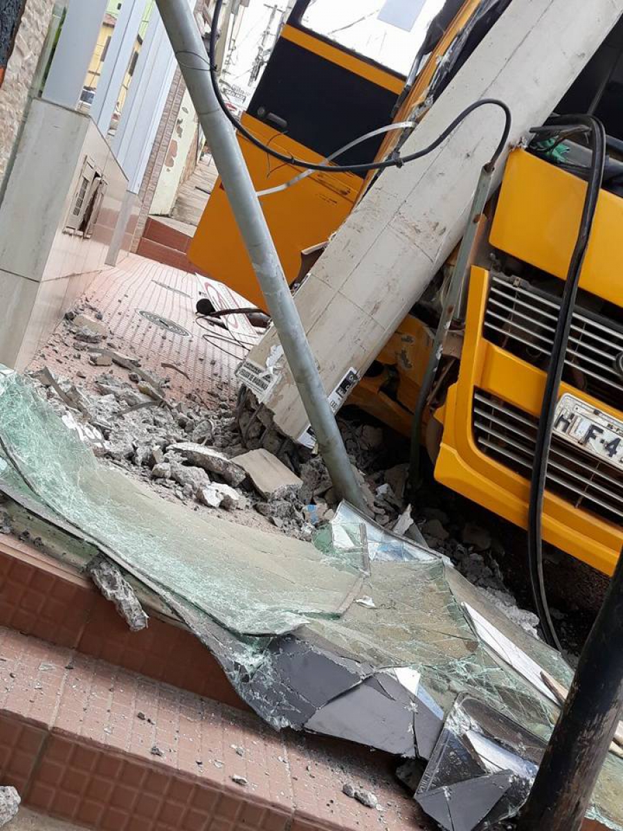 Ao que tudo indica, o veículo desceu desgovernado pela rua, passou raspando pelo meio fio e bateu no poste em frente a Clínica Crescer; o impacto da batida destruiu a frente do ônibus e arrastou a fiação dos estabecimentos vizinhos.