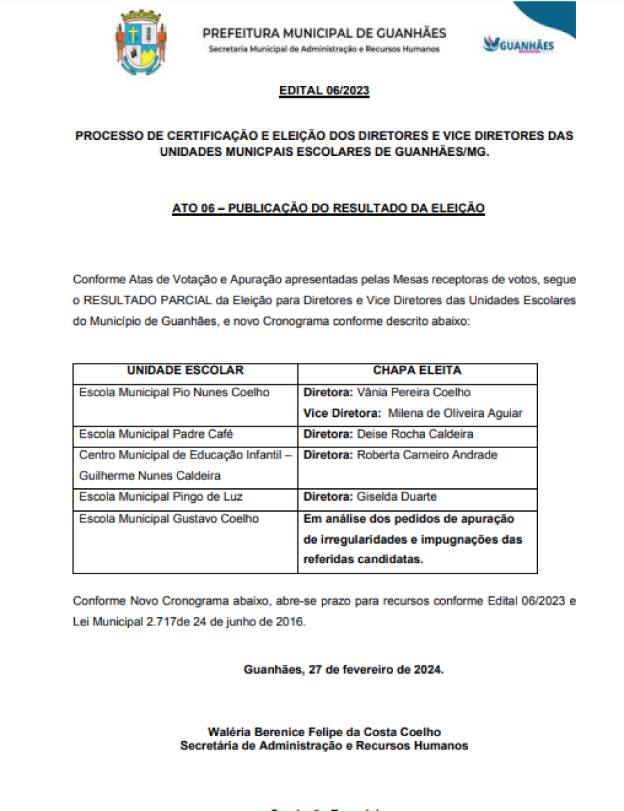 Na tarde dessa quarta-feira (28) a Prefeitura Municipal de Guanhães divulgou em seu site o resultado das Eleições para as novas Diretorias das Escolas Municipais da cidade. A votação ocorreu na última quinta-feira (22) e contou com a participação de pais e funcionários das escolas.