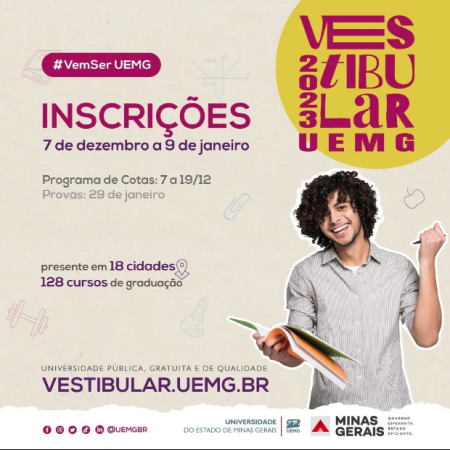 As inscrições para o Programa de Cotas também estão abertas, mas somente até o dia 19 de dezembro. As provas serão aplicadas no dia 29 de janeiro. Para mais informações acesse: vestibular.uemg.br.