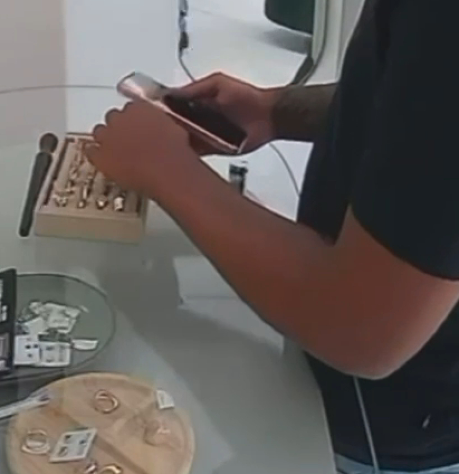 Nas imagens, é possível ver o momento exato em que ele pega uma pulseira, coloca embaixo do celular; e na sequência mais dois anéis. Depois, juntamente com o celular, ele guarda tudo no bolso.