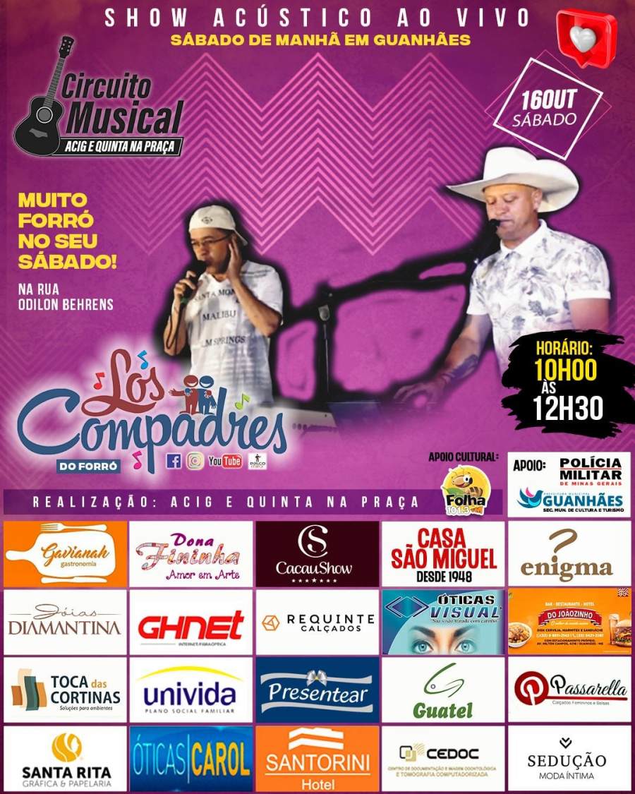 Neste sábado (16), tem mais uma edição do Circuito Musical em Guanhães. A iniciativa é da Associação Comercial e Empresarial de Guanhães (Acig) e do Quinta na Praça.