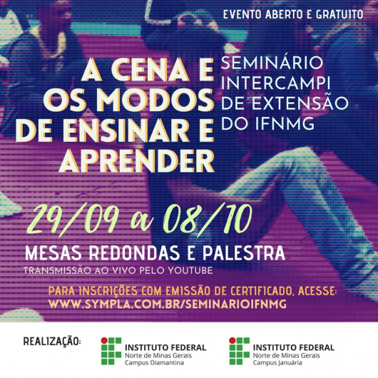 O Campi Diamantina do IFNMG está realizando de forma virtual, o Seminário de Extensão Intercampi: A cena e os modos de ensinar e aprender. Neste momento marcado pelo isolamento social, duas linguagens artísticas próprias à coletividade – o teatro e a dança – serão os assuntos das quatro mesas-redondas e da palestra que fazem parte da programação.