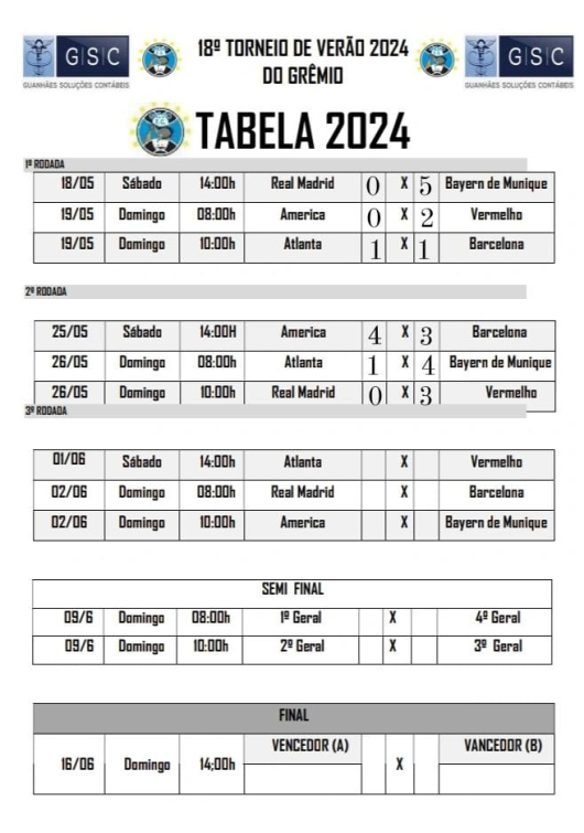 No domingo (9), ocorrerão as semifinais da 18ª edição do Torneio de Verão do Grêmio Futebol Clube. Confira os resultados da 3ª rodada, realizada no último final de semana: