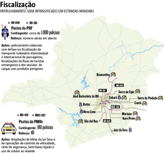 Para evitar incidente, as polícias Rodoviária Federal (PRF) e Militar Rodoviária (PMRv) terão reforço no efetivo e focarão a fiscalização em locais estratégicos. Os pontos considerados primordiais pela Polícia Rodoviária Federal (PRF) ficam nas principais rodovias do Estado: BRs 040 e 381. A atenção estará voltada especialmente para Juiz de Fora, que receberá nove delegações.